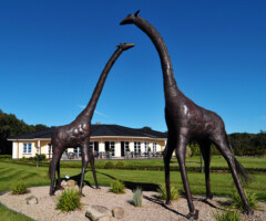 From the white pillars supporting the entrance, the light colours on the outside and the spacious grounds with animal sculptures it feels rather like a holiday home under an african sky. Inside the theme continues, classic African influences in all categories of our rooms. You can look forward to tasteful interior where carefully selected accessories delight and surprise you during your stay at our family run Hotel and Restaurant “Simola”.
